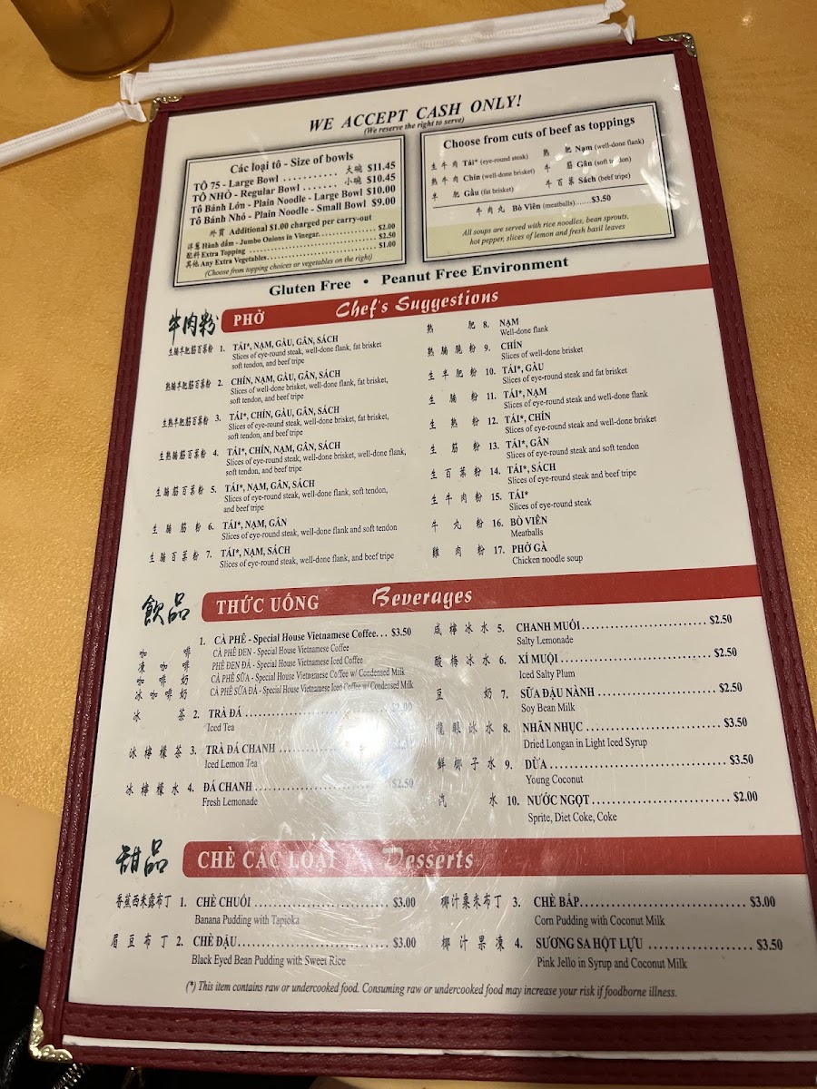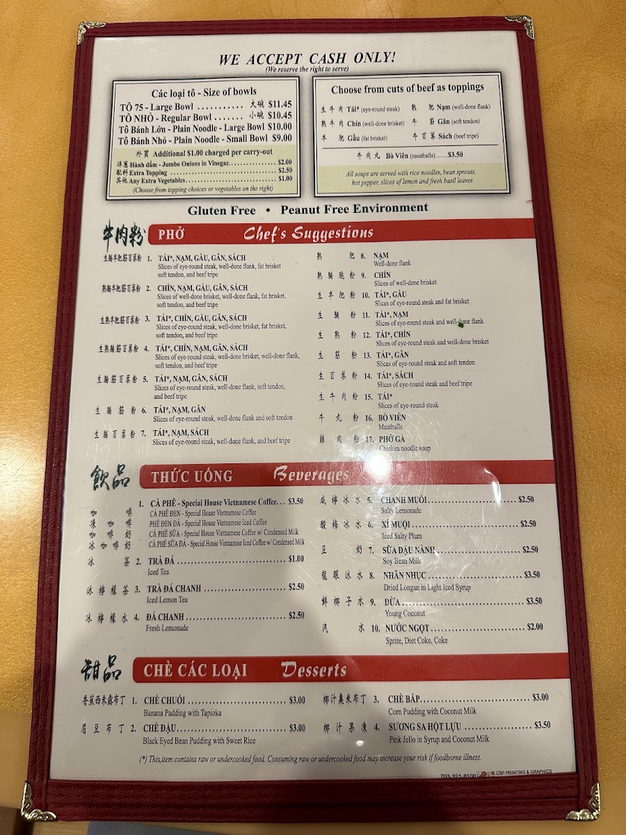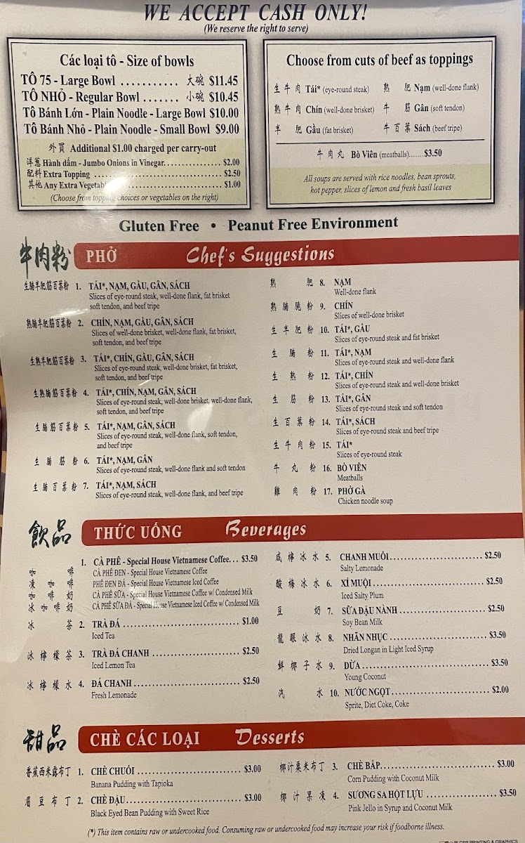 Phở 75 in Centreville offers a satisfying array of traditional Vietnamese dishes, especially focusing on their diverse phở offerings. Their beef phở options include Tái, Nam, Gầu, Gân, Sách, and a variety of combinations, with each dish served with fresh herbs and rich broth. For those who prefer a different cut of beef, there are options like Chín, Nạm, and Tái with a range of textures. Additionally, Tôn Bánh Lớn and Tô Nhỏ offer different serving sizes to cater to any appetite. The restaurant also offers refreshing beverages like Chanh Muối, Xí Muội, and Sữa Đậu Nành Nhãn Nhục, as well as classic Vietnamese drinks like Cà Phê Sữa and Trà Đá. For dessert, they serve sweet treats like Chè Chuối, Chè Đậu, and Chè Bắp Sương Sa Hột Lựu. Whether you're in the mood for a light snack or a full meal, Phở 75 has something to satisfy every craving with its generous portion sizes and authentic flavors.